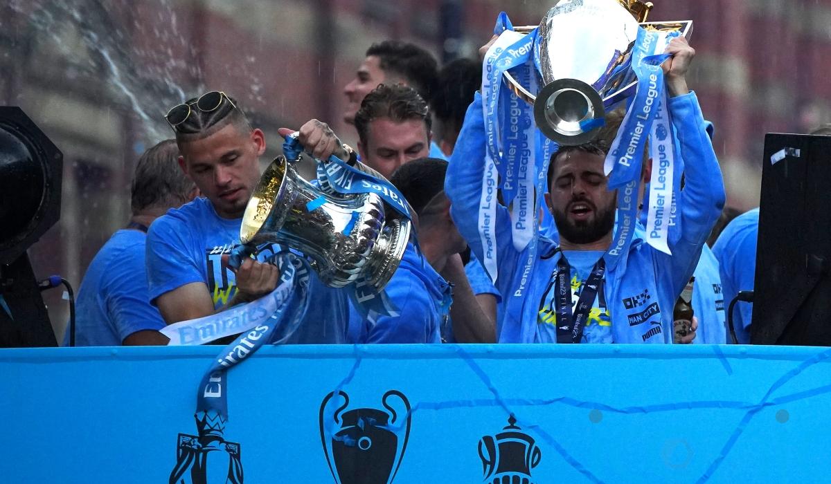 Defender Nathan Ake held aloft the Premier League trophy to the delight of the City fans who had braved the rain, many following down on foot towards the stage celebrations once the route was clear.