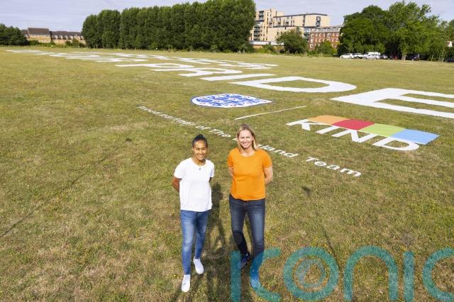 ::KIND Snacks have created a GIANT message of support for the Lionesses as they head off to Australia for the first game in the tournament. The 100m wide sign was made out of thousands of messages of support from the public, including ex-Lionesses Rachel Yankey and Faye White.
