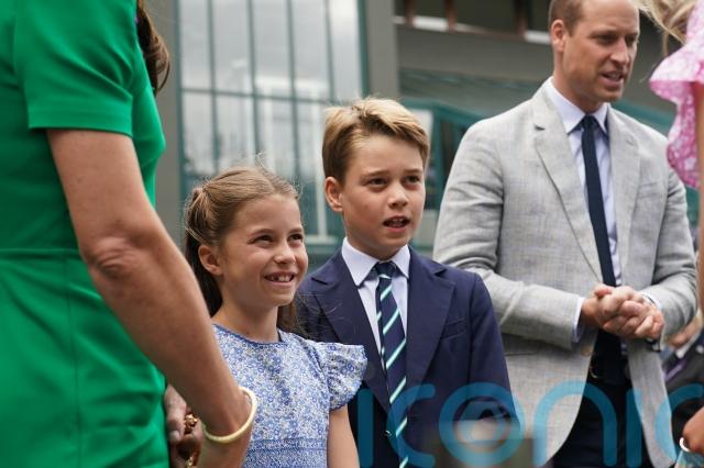Wearing a blue dress, she held Kate’s hand and walked ahead of George and William to reach the Players’ Lawn and greeted Wimbledon staff, police dog Stella and British wheelchair doubles champion Gordon Reid.