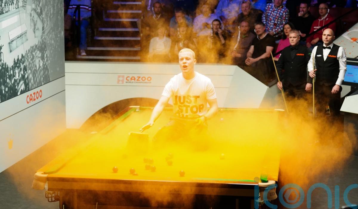 A Just Stop Oil activist who jumped on a table during the World Snooker Championship and covered it with orange powder has told a judge his actions were “reasonable and proportionate in the light of the greater threat we are facing from the climate crisis”.