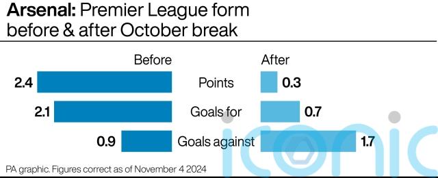 The recent slump is in contrast to Arsenal’s form up to last month’s internationals, when they were unbeaten in their first seven league games and 10 in all competitions.
