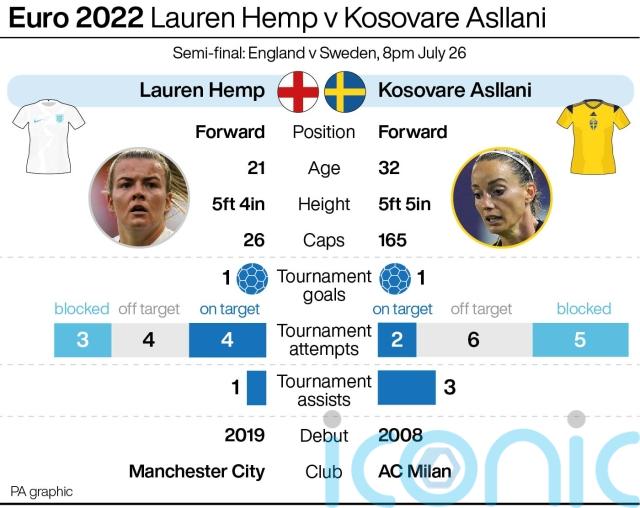 Here, the PA news agency takes a look at how rival wingers Lauren Hemp and Kosovare Asllani could help decide the first place in Sunday’s final.
